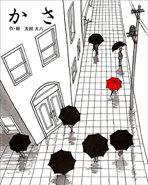 文研出版から出版されている『かさ』は、幼少期の雨の体験を思い出されてくれる絵本。テキストは一切書かれず、淡々と物語が進んでいく。内容もとてもシンプルなもので、雨の日、少女が自分の傘をさし、大人用の傘を一本持って、駅まで父親を迎えにいくというもの。雨の日の静かなまちの様子や道中の少女の心情が、言葉がないぶんすっと読者の心に描きやすいような構成になっている。全体が白黒で少女の傘だけが赤色というのも演出として効いていて、彼女の雨に対する心の有り様がよくあらわれている。読み進めると、幼少期の雨の日の記憶が心に流れてくるようだ。